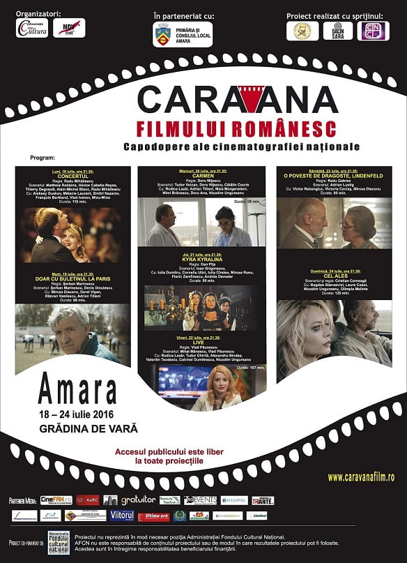 Accesul publicului care va dori să participe, în perioada 18 – 24 iulie 2016, ora 21.30, la proiecţiile Caravanei filmului românesc de la Grădina de Vară din Amara, este liber.