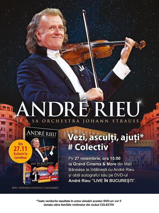 Vineri, 27 noiembrie, la ora 15:00 te întâlnești cu André Rieu în foaierul Grand Cinema & More și obții autograful său pe exemplarul DVD-ului André Rieu – Live în București. Toate veniturile realizate în urma vânzării acestui dvd vor fi donate victimelor din Club Colectiv.
