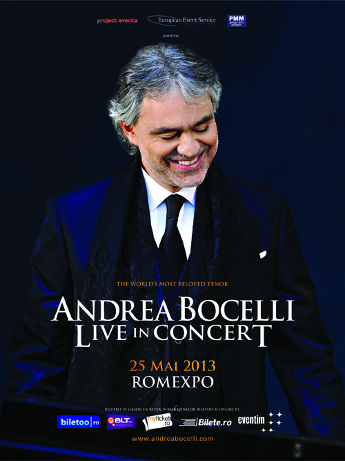 In luna mai a anului 2013 tenorul va ajunge pentru prima oara la Bucuresti, pentru un concert ce se anunta inca de pe acum a fi unul de zile mari. Este pentru prima oara cand cel mai iubit tenor din lume concerteaza in Romania! Toti admiratorii artistului trebuie sa stie ca biletele au preturi cuprinse intre 150 de lei si 1400 de lei si ca se gasesc in urmatoarele locatii: Magazinul BILETOO din Unirea Shopping Center (parter, intrarea de langa McDonald’s), Magazinul BILETOO din Cinema Patria, Sala Palatului, Magazinele Flanco, Librariile Adevarul si Eminescu, Magazinele Diverta, Muzica, Vodafone, Germanos, Domo, Palatul National al Copiilor dar si din Oficiile Postei Romane semnalizate bilete.ro. Cei ce doresc sa comande biletele online, o pot face de pe BILETOO.ro, BLT.ro, BILETE.ro, MYTICKET.ro si EVENTIM.ro.