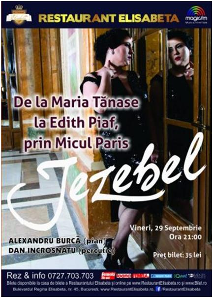 Pentru prima dată vă invităm să trăiți o experiență interbelică autentică, “De la Maria Tanase la Edith Piaf, prin Micul Paris”, vineri, 29 septembrie, ora 21:00, evocată de vocea nemaipomenită a lui Jezebel, aka Izabela Barbu, acompaniată de îndrăgitul pianist Alexandru Burca și de Dan Incrosnatu, un virtuos al percuției.