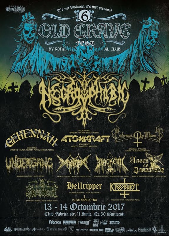 Old Grave Fest VI, 13-14 Octombrie 2017, Club Fabrica, Bucuresti, Romania. Abonamente la pret de 115 lei se gasesc la http://www.rtmc.ro/old-grave-fest-2017/tickets/, pe platforma www.iabilet.ro sau direct de la membrii RTMC.