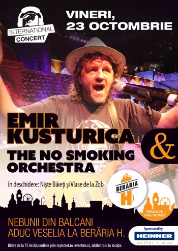 Vineri 23 octombrie, dupa ora 22, suntem invitati in Beraria H la un concert-eveniment Emir Kusturica & The No Smoking Orchestra, cu un setlist ce va include atat piese de pe coloana sonora a filmelor “Pisica albă, Pisica neagră” sau “Life is a miracle” ( Bubamara, Upside down, Meine Stadt, Pitbull Terrier, Was Romeo Really a Jerk?, Devil in the business class, Evergreen, Wanted Man, Unza – Unza), dar şi melodia preferată a orchestrei: “F**k you MTV“.