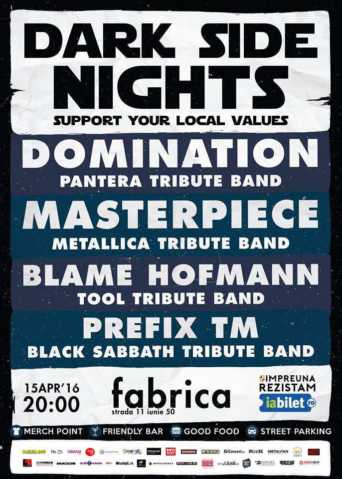 Vineri, 15 aprilie, club Fabrica şi Dark Side Booking Academy vă asteaptă la o seară tribut cu Domination (Pantera tribute band), Masterpiece (Metallica tribute band), Blame Hofmann (Tool tribute band) şi Prefix TM (Black Sabbath tribute band).