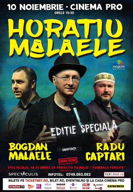 Horațiu Mălăele va fi secondat pe scenă de fiul său, Bogdan Mălăele, și de muzicianul Radu Captari.