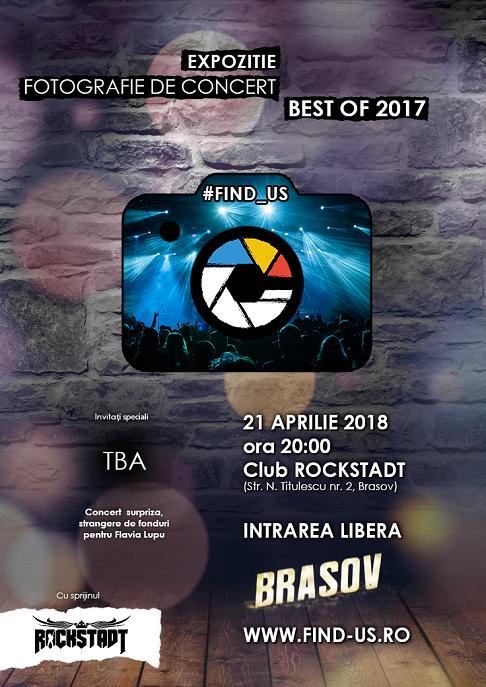 FIND_US, Asociatia Fotografilor de Concert, organizeaza, cu sprijinul clubului Rockstadt din Brasov, o noua editie a expozitiei BEST OF #FIND_US 2017, ce va avea loc in perioada 21 aprilie – 21 mai 2018, eveniment destinat strangerii de fonduri pentru FLAVIA LUPU (37 de ani, tehnician dentar), una dintre supravietuitoarele tragediei din Colectiv.