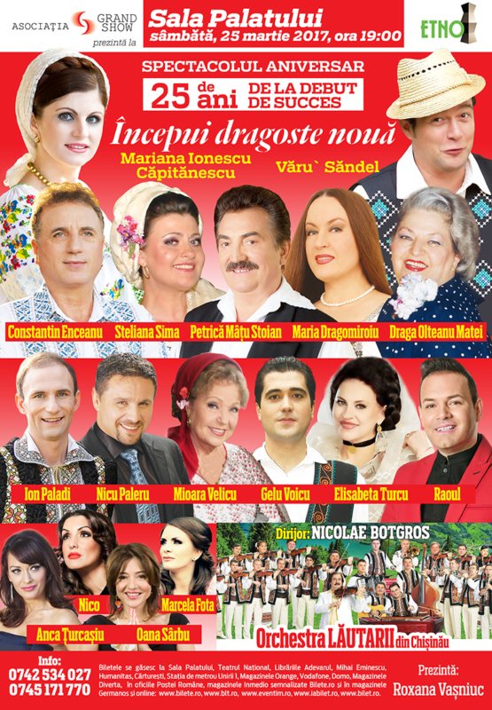 Sambata, 25 martie, de la ora 19:00, in zi de mare sarbatoare pentru romani, Sala Palatului gazduieste un spectacol grandios, care va marca 25 de ani de la debutul de succes impliniti de Mariana Ionescu-Capitanescu si Varu’ Sandel.