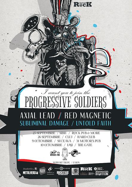 Progressive Soldiers împreună cu Jurnal Rock, vă invită la un eveniment tematic 100% progressive, 100% românesc. Soldaţii care vor “mărşălui” sub îndrumarea unor tonalităţi de prog rock sau prog metal sunt Red Magnetic și Axial Lead, alături de Subliminal Damage şi Untold Faith.