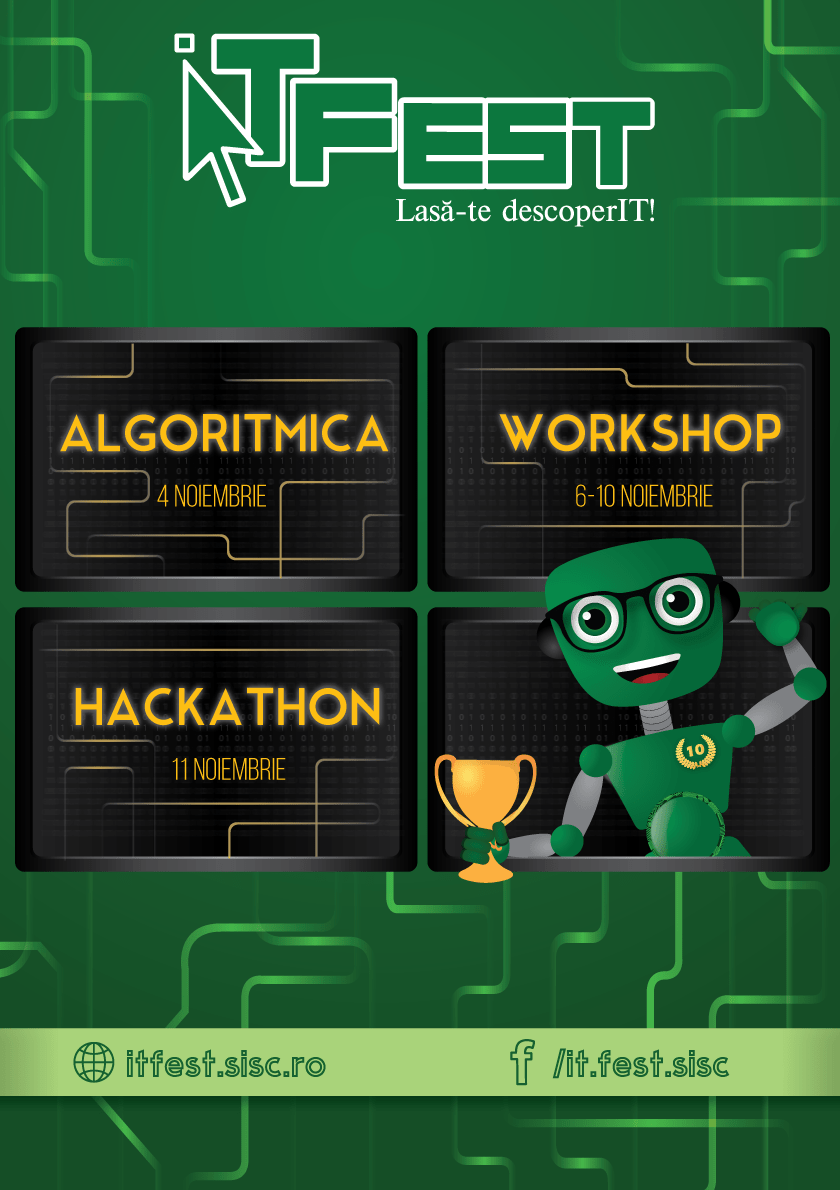Mai multe informații despre proiect se găsesc pe site-ul http://itfest.sisc.ro/ sau pe pagina de facebook https://www.facebook.com/it.fest.sisc/, unde echipa de organizare îți stă la dispoziție pentru întrebări și detalii suplimentare.
