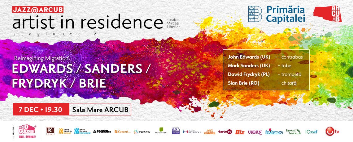 John Edwards, Mark Sanders, Dawid Frydryk și Sian Brie cântă joi, 7 decembrie, de la ora 19:30, în cadrul seriei Jazz @ ARCUB – Artist in Residence, organizată de ARCUB cu sprijinul Primăriei Capitalei.