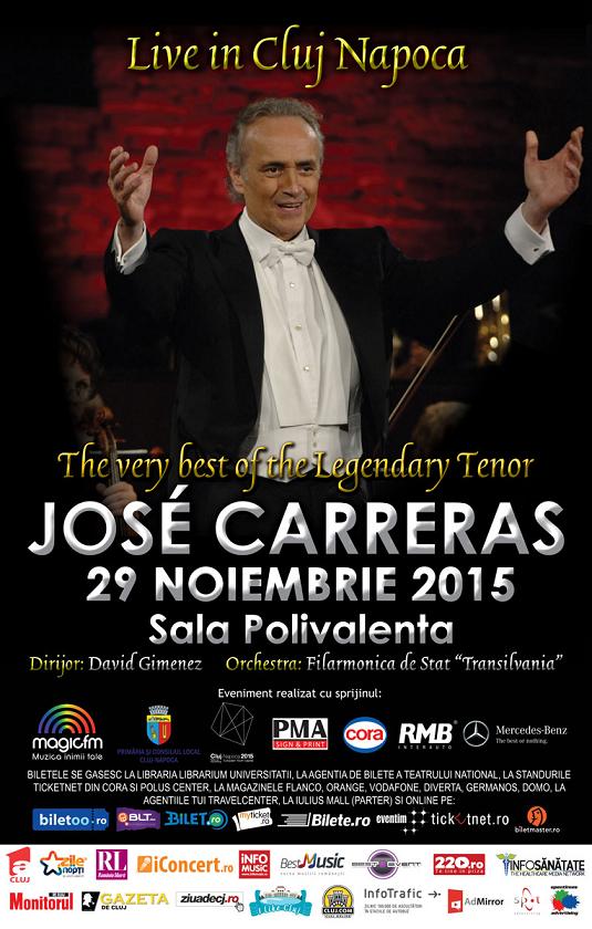 Muzica plina de pasiune si emotie a legendarului tenor Jose Carreras va rasuna duminica seara la Sala Polivalenta! Concertul de la Cluj-Napoca va fi o premiera pentru marele tenor, acesta fiind primul concert sustinut de artist in acest oras!