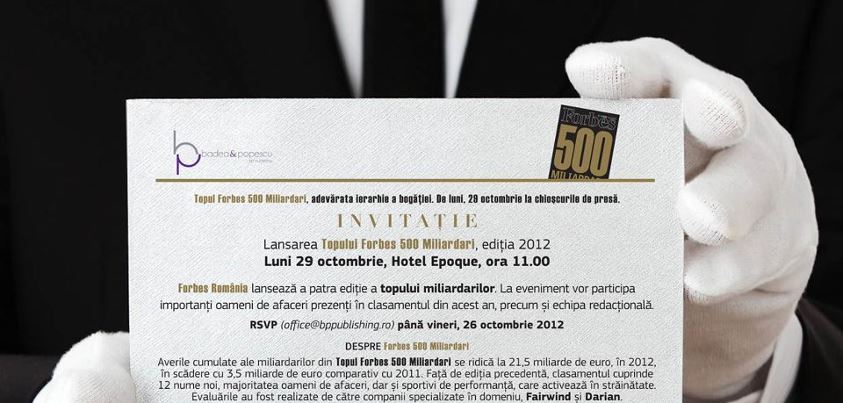 Cel mai bogat român va participa astazi, 29 octombrie, orele 11, la hotel Epoque, la conferinta de presa pentru lansarea TOPULUI – Forbes 500 Miliardari.