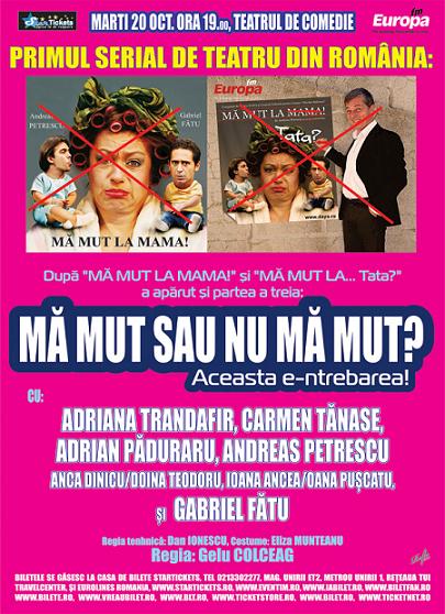 Cei care nu au văzut încă primele două părţi ale acestui foileton teatral, au ocazia să ia parte la ele, după următorul program: pe 19 octombrie “Mă mut la mama!”, cu Adriana Trandafir, Andreas Petrescu şi Gabriel Fătu se joacă la Teatrul De Comedie.