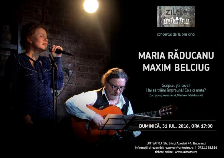 Duminică, 31 iulie 2016, Zilele Unteatru vă invită la concert. La ora cinci (17:00), Maria Răducanu și Maxim Belciug urcă împreună pe scenă pentru a-și adăuga cântecele la sărbătoarea celui mai grăitor fenomen teatral apărut în ultimii ani în spațiul independent de la noi. Un concert pe care afișul îl preludează cu un vers de Maiakovski: “Scripco, ştii ceva? Hai să trăim împreună! Ce zici mata?”