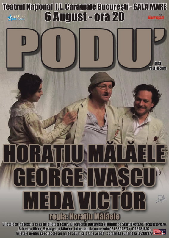 6 AUGUST – PODU’ – un spectacol emblematic în care un intelectual neînţeles, un îndrăgostit, şi o artistă trec prin situaţii de un absurd şi un umor copleşitor, stând la coadă în faţa morţii.