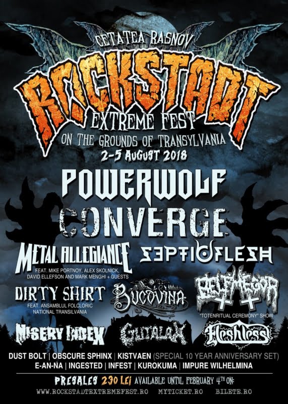 Pana in acest moment au confirmat POWERWOLF, CONVERGE, METAL ALLEGIANCE, SEPTICFLESH, BELPHEGOR (Totenritual Ceremony) , BUCOVINA, DIRTY SHIRT (alaturi de Ansamblul Folcloric National Transilvania), MISERY INDEX, GUTALAX, FLESHLESS, INGESTED, E-AN-NA, DUST BOLT, OBSCURE SPHINX, INFEST, KISTVAEN (Special 10 anniversary show), KUROKUMA, IMPURE WILHELMINA.