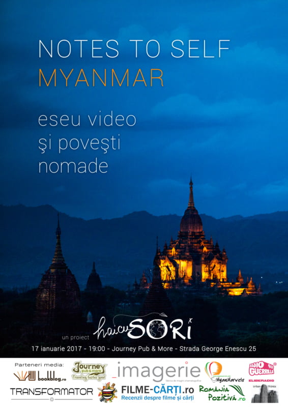 Pe 17 ianuarie 2017, ora 19:00 la Journey Pub & More, Sori Țigăeru povesteşte despre călătoria ei in Myanmar şi despre răspunsurile pe care i le-a oferit, cuprinse în eseul video “Notes to Self – Myanmar”.