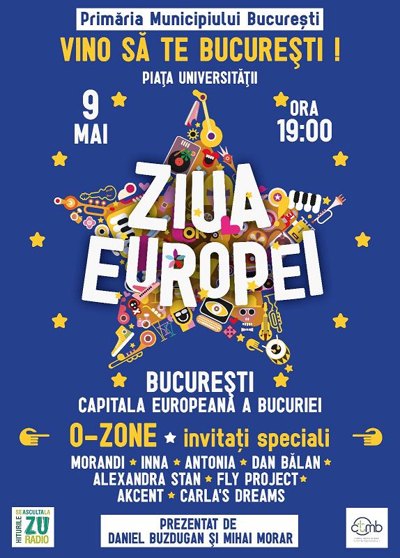 Bucureștenii sunt invitați să petreacă Ziua Europei în Piața Universității. Anul acesta, când se sărbătoresc 10 ani de la intrarea României în Uniunea Europeană, va fi organizat un spectacol care reunește artiști români care au avut succes peste granițele țării noastre.