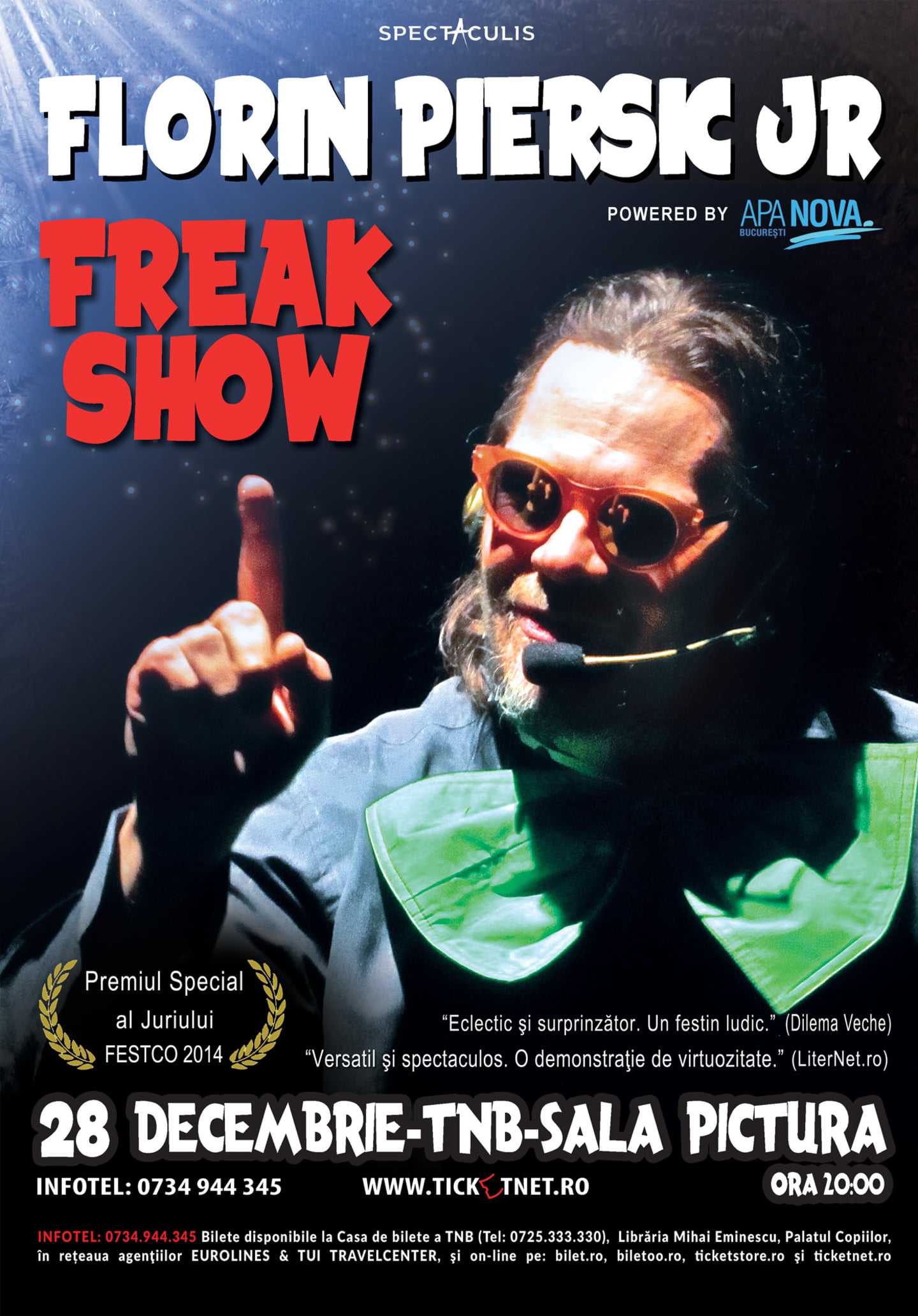 La final de an, pe 28 decembrie 2015, de la orele 20.00, spectatorii bucureșteni se vor reîntâlni cu Florin Piersic jr., care va fi prezent la Teatrul Național București – Sala Pictură, cu spectacolul Freak Show.