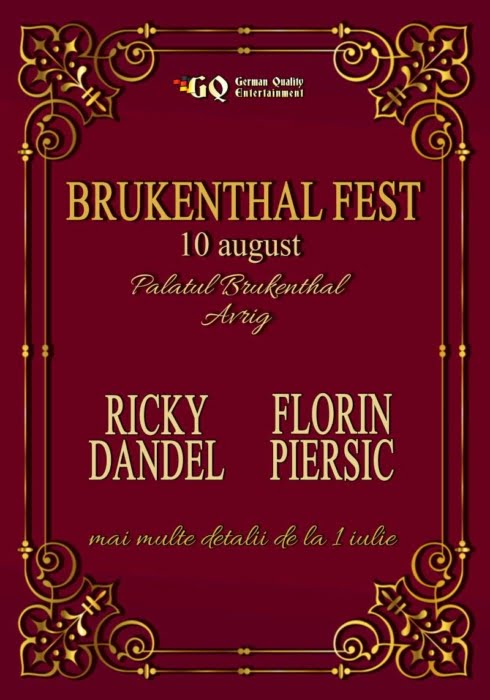Eveniment de tinuta la Palatul Brukenthal din Avrig, alaturi de artisti celebri. In ordine alfabetica: Ricky Dandel si Florin Piersic, pentru o seara relaxanta de vara, pe 10 august, cu amintiri dintre cele mai placute, chiar la poalele Carpatilor Transilvaneni, intr-un decor mirific, un ansamblu arhitectural baroc, unic in Europa, ce a fost Resedinta de Vara a lui Samuel von Brukenthal.