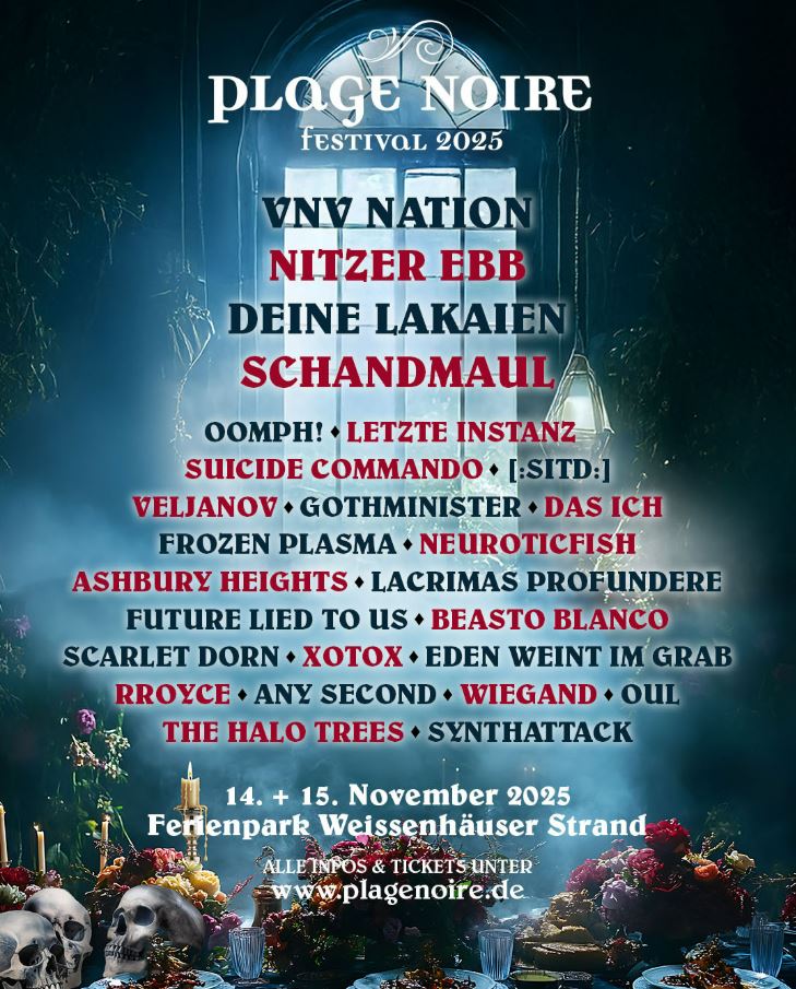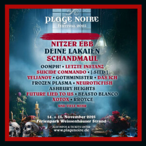 Headlines at Plage Noire 2025 are Nitzer Ebb. In addition, the following artists have confirmed their attendance so far (as of 02/2025): [:SITD:], Ashbury Heights, Beasto Blanco, Das Ich, Deine Lakaien, Frozen Plasma, Future Lied To Us, Gothminister, Letzte Instanz, Neuroticfish, Oomph!, Rroyce, Schandmaul, Suicide Commando, Veljanov and Xotox