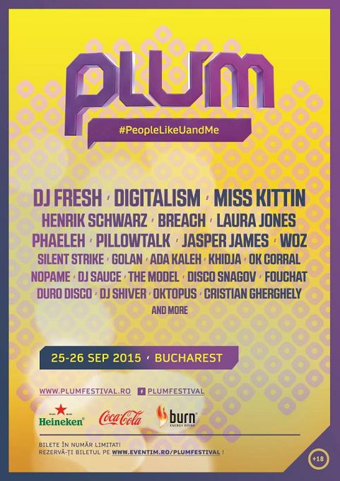 PLUM va avea loc in weekendul 25 – 26 septembrie, intr-o locatie ce va fi anuntata ulterior, iar line-up-ul primei editii include nume ca DJ Fresh si Breach (pentru prima data in Bucuresti), Digitalism si Henrik Schwarz (in premiera in Romania), Miss Kittin, Phaeleh, PillowTalk, Jasper James, Laura Jones, Woz, Golan, Silent Strike, Khidja, Nopame, Ada Kaleh, The Model si Fouchat.
