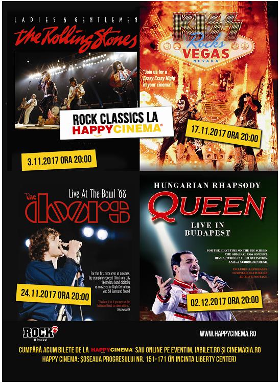 Rock Classics: concerte legendare Rolling Stones, KISS, The Doors și Queen se văd, începând cu 3 noiembrie, remasterizate, sonorizare 5.1, la Happy Cinema București în Liberty Center.