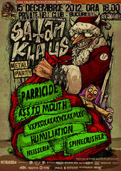 Astfel, pe 15 decembrie 2012, de la ora 18.00, veti putea vedea la lucru, pentru ultima data in cadrul Satan Klaus Metal Party, trupele PARRICIDE (old school grindcore din Polonia), ASS TO MOUTH (noua revelatie poloneza fast brutal grindcore), VxPxOxAxAxWxAxMxC (crazy porno slam grindcore din Austria), HUMILIATION (old school death metal exotic din Malaezia), SPINECRUSHER (thrash death metal, noua speranta a scenei bucurestene) si NEISSERIA (o noua trupa heavy thrash death metal din undegroundul bucurestean, la prima aparitie live).