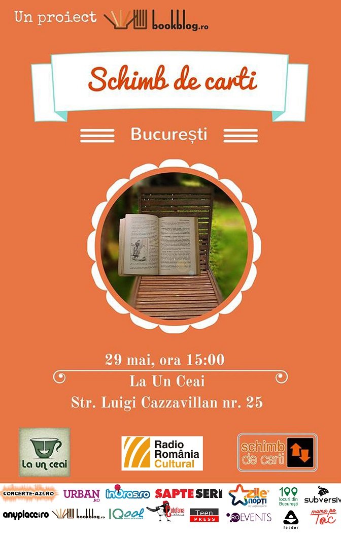 Soarele și vremea frumoasă îndeamnă la citit în aer liber, de aceea ne vedem duminică, 29 mai, între orele 15:00 – 17:00 la ediția din luna Mai a întâlnirilor Schimb de Cărți București în grădina cochetă de la ceainăria La Un Ceai (Str. Luigi Cazzavillan nr. 25).