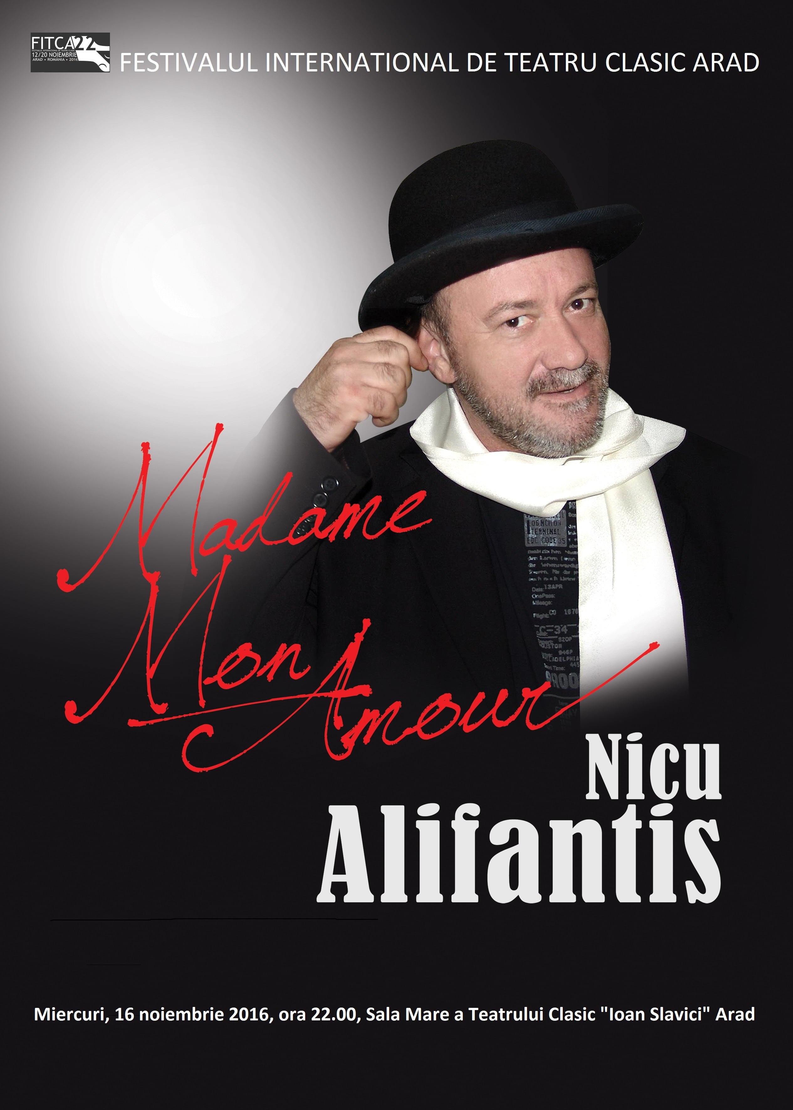 Miercuri, 16 noiembrie, ora 22.00, în Sala Mare a Teatrului Clasic „Ioan Slavici” din Arad, Nicu Alifantis va susţine un recital-manifest, un răspuns la întrebarea retorică a poetului Nichita Stănescu: „De ce te-oi fi iubind, femeie visătoare, care mi te-ncolăceşti ca un fum…”. L-a numit sugestiv Madame Mon Amour, pentru că este o poveste de dragoste spusă în diferite feluri, ritmuri, graiuri, sonorităţi neaşteptate, aidoma unui mozaic. Un concert dedicat femeii, dragostei şi prieteniei.