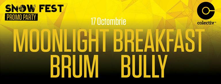 Snow Fest Promo Party II va avea loc in data de 17 octombrie 2015 in Club Colectiv din Bucuresti si ii va avea ca protagonisti pe Moonlight Breakfast, Brum si Bully.