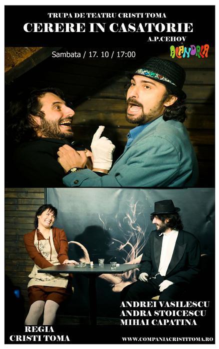 Alandala va invita sambata, 17 octombrie, de la ora 17:00 la reprezentatia piesei de teatru “Cerere in casatorie” de A.P. Cehov, in regia lui Cristi Toma.