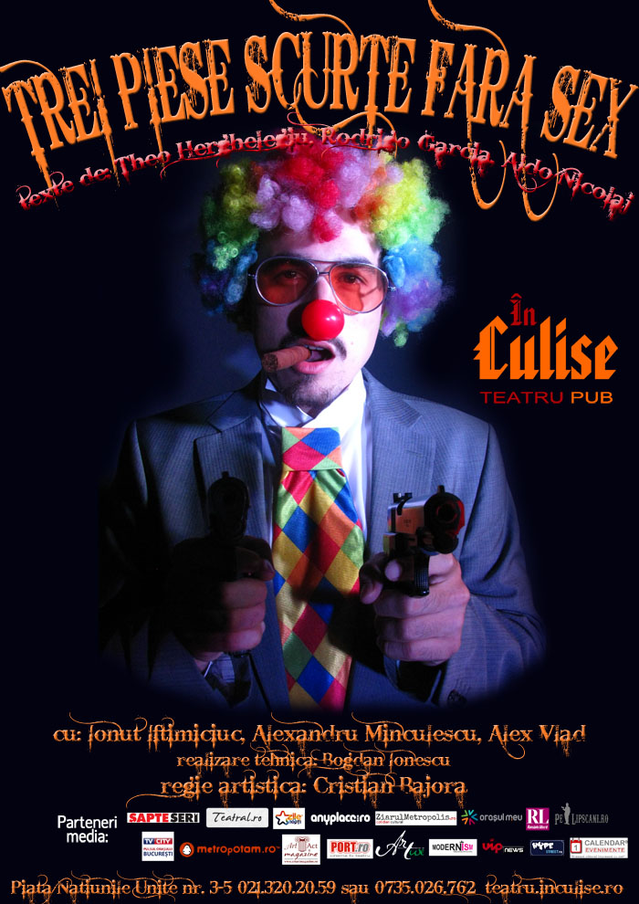 Sâmbătă, 30 Noiembrie, ora 19:00, Teatrul In Culise nu te așteaptă la O piesă de teatru, ci la TREI PIESE SCURTE FĂRĂ SEX (tragicomedie 18+).