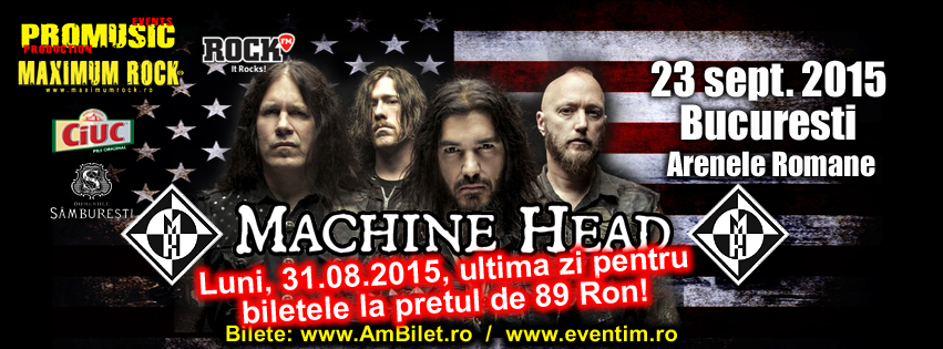 De retinut: Biletele la concertul Machine Head comandate prin www.AmBilet.ro sunt livrate automat pe e-mail, in format electronic, sub forma unui PDF ce contine un cod de bare si datele evenimentului. Acestea pot fi tiparite de dumneavoastra sau le puteti prezenta la intrare, direct de pe ecranul telefonului/tabletei.